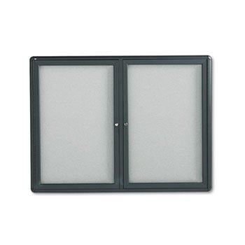Enclosed Bulletin Board, Fabric Covered Cork, 48 x 36, Gray, Aluminum Frame by QUARTET (Catalog Category: Presentations & Meeting Supplies / Boards/Presentation) A smart, contemporary way to post and protect information. Gray fabric-covered surface provides resilient tacking area. Clear acrylic window ensures visibility for your message while locking doors secure documents in place. Radius-edged, powder-coated aluminum frame. Full-length piano hinges. Includes security mounting hardware and one key per lock. Board Width: 48 in; Board Height: 36 in; Board Depth: N/A; Surface Material: Fabric Covered Cork.