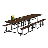 | ✚✚✚ KI Furniture Cafeteria Table 10' long with Bench Seating This 10' cafeteria style table with bench seating has durable high pressure laminate tops and benches with bull nose edging. Combination pneumatic lift assist and torsional energy storage system provides a controlled, effortless folding operation. 4'' casters do not extend beyond the tabletop, eliminating potential tripping hazard. Floor glides prevent floor dents. Clearance between top halves prevents pinched fingers. UF10/BE/BN/BL