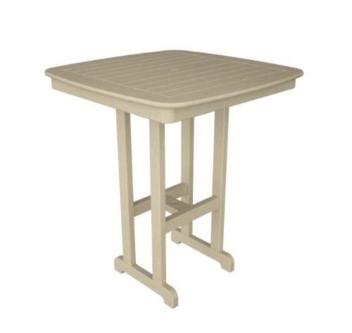 #Patio Table/khaki/all weather/made of recycled plastic bottles and steel hardware/42''H x 36.75''W x 36.75''D/umbrella hole in middle/wash with soap and water/assembly needed/inside or outside use/made in USA/allow up to 10 additional days to ship, made to order