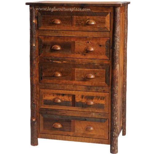 Cottage Barnwood 5 Drawer Chest . The Cottage Barnwood 5 Drawer Chest is made from reclaimed Red Oak planks from 1800's tobacco barns. The drawers are inset and feature antique rusted iron hardware. There are two options for the drawers. You may order them standard with euro glides, or upgrade to the premium drawers which feature aromatic red cedar drawer bottoms and full-extension ball-bearing glides. Both the euro glides and the full extension glides are rated at 100 lbs. The Cottage Barnwood 5 Drawer Chest is finished in a dull catalyzed lacquer which is extra durable and retains the natural character of the wood. The barnwood chest can be trimmed in the standard hickory log trim or you may choose reclaimed barnwood trim. Enjoy this unique five drawer chest in your rustic home, whether it is a log cabin, rustic lodge, farm house, or even a country cottage! Antique rusted iron handlesClear lacquer finish Individually hand crafted.Choose from standard hickory log trim or reclaimed barnwood trimDrawers may be ordered standard or upgraded to premium: Standard: The standard style will feature Standard Drawer Bottoms and Nylon Roller Glides rated at 100 lbs. Premium: The premium style will feature Aromatic Cedar Drawer Bottoms and Full-Extension Ball-Bearing Glides rated at 100 lbs. Find more reclaimed barn wood furniture in the Cottage Barnwood collection here: Cottage Barnwood