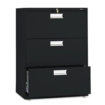 600 Series Three-Drawer Lateral File, 30w x19-1/4d, Black by HON (Catalog Category: Furniture & Accessories / File Cabinets) Counterweight included, where applicable, to meet ANSI/BIFMA stability requirements. Lock secures both sides of drawer and heavy-duty, three-part, telescoping, steel ball bearing suspension offers smooth drawer operation. Mechanical interlock allows only one drawer to be open at a time to inhibit tipping. Four adjustable leveling glides help compensate for uneven flooring. Drawers include side-to-side hangrails for letter or legal size filing and bright, anodized aluminum recessed drawer pulls, plastic label holder. HON "One Key" interchangeable core removable locks. Color: Black; Overall Width: 30 in; Overall Depth: 19 1/4 in; Overall Height: 40 7/8 in.