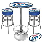 | ✚✚✚ Ultimate Miller Lite Gameroom Combo - 2 Bar Stools and Table Made in the USAThis Officially Licensed Miller Lite Game Room Set includes one Pub Table and Two Barstools.The bar stools are very high quality stools with a comfortable padded seat that swivels 360 degrees. The Pub table features an acrylic top with crystal clear reverse side printing. The 1 inch thick solid wood top and full chrome base with foot rest makes this a heavy durable unit.Stool Features included:chrome plated double rung base adjustable levelers 7.5 inch high by 14.75 diameter padded seat Commercial grade vinyl seat 30 inch high bar stool great for bar pub table and barsTable Features include: 28 inch diameter scratch resistance acrylic top waterproof printing because the printing is directly printed on the reverse side of the acrylic chrome base with foot adjustable height foot rest solid wood top under the acrylic height of the table is 42 inchesGreat for gifts and recreation decor.