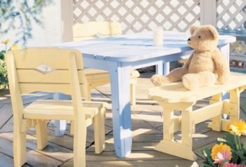 Kids Picnic Table White?UWharrie Kids Picnic Table Beautiful Comfort Rustically styled UWharrie chairs are crafted from hand selected pressure treated solid pine lumber, painted and lightly distressed for a beautiful, weathered antique look. They require no additional protection from the elements. Exposure to weather will enhance their rustic appearance, but will not damage them. Weight: 65 lbs. Dimensions: 33"W x 38"D x 44"H Please allow up to 3-4 weeks for delivery Color Chart About Uwharrie The Original Uwharrie Chair was created to offer not only all-weather seating, but classically styled, comfortably designed outdoor accents. With their rugged good looks and solid construction, the chairs and their companion pieces provide a balance of aesthetic charm and lifestyle integrity. It is insect and rot resistant, it may be stained or painted (or left natural), and it's milled from a renewable resource: plantation grown southern pine. Uwharrie Chair Company uses heavy, one inch thick premium grade lumber kiln dried after it has been treated. Paints used to coat Uwharrie Chair products are latex enamel.